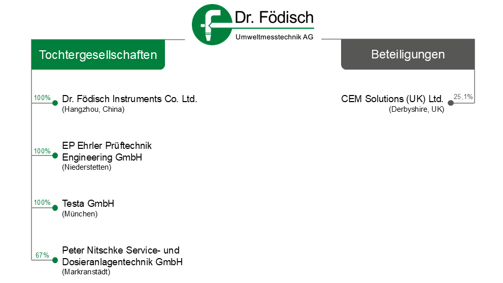 Gemeinsam mit unseren Tochterunternehmen und Beteiligungen fungiert die Dr. Födisch Umweltmesstechnik AG als Muttergesellschaft in einem starken Verbund – der Födisch Gruppe. Der Konzern wurde im Jahr 2000 mit Erwerb von Anteilen an der Fanalmatic GmbH und der Peter Nitschke GmbH gegründet und sukzessiv erweitert. Die gewachsene Zusammenarbeit und dichte Vernetzung gibt uns die Möglichkeit, eigene Projektkonzepte zu entwickeln sowie Strategien zur Internationalisierung branchenübergreifend zu entwickeln und umzusetzen.